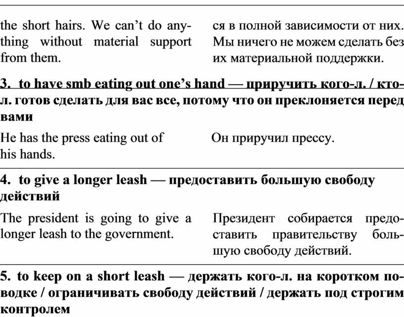 5. to keep on a short leash — держать кого-л. на коротком по-водке / ограничивать свободу действий / держать под строгим контролем