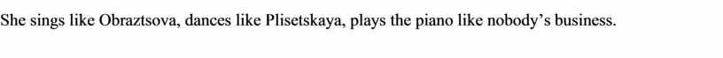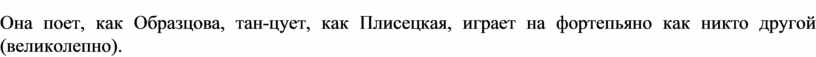 Она поет, как Образцова, тан-цует, как Плисецкая, играет на фортепьяно как никто другой (великолепно).