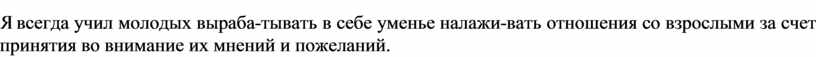 Я всегда учил молодых выраба-тывать в себе уменье налажи-вать отношения со взрослыми за счет принятия во внимание их мнений и пожеланий.