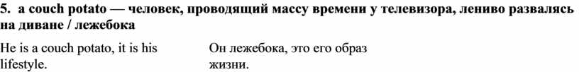 5. a couch potato — человек, проводящий массу времени у телевизора, лениво развалясь на диване / лежебока