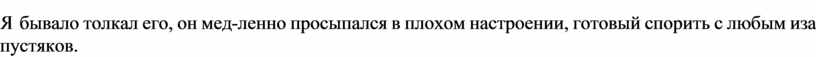 Я бывало толкал его, он мед-ленно просыпался в плохом настроении, готовый спорить с любым иза пустяков.