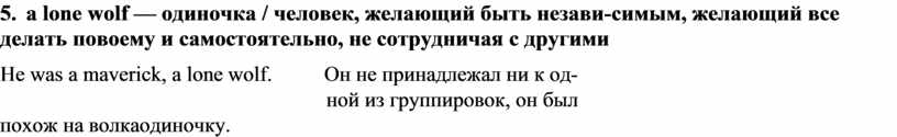 5. a lone wolf — одиночка / человек, желающий быть незави-симым, желающий все делать повоему и самостоятельно, не сотрудничая с другими