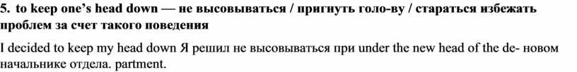 5. to keep one’s head down — не высовываться / пригнуть голо-ву / стараться избежать проблем за счет такого поведения