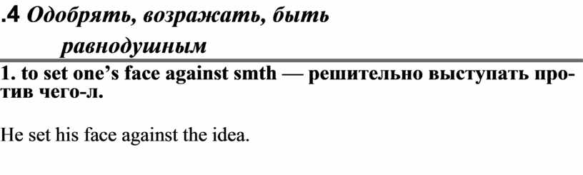1. to set one’s face against smth — решительно выступать про-тив чего-л.