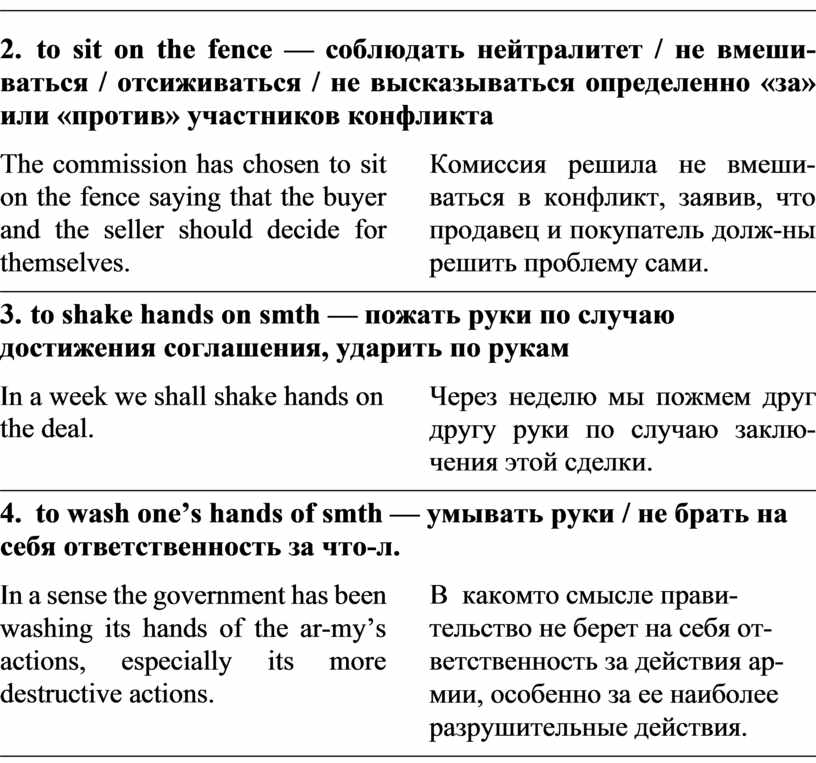 2. to sit on the fence — соблюдать нейтралитет / не вмеши-ваться / отсиживаться / не высказываться определенно «за» или «против» участников конфликта