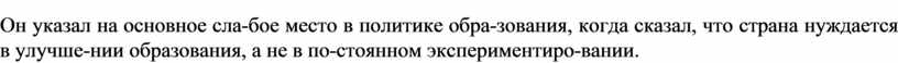 Он указал на основное сла-бое место в политике обра-зования, когда сказал, что страна нуждается в улучше-нии образования, а не в по-стоянном экспериментиро-вании.