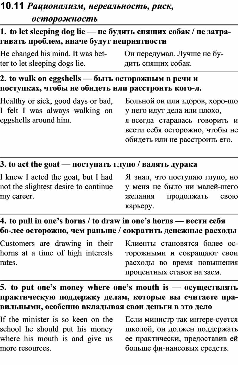 5. to put one’s money where one’s mouth is — осуществлять практическую поддержку делам, которые вы считаете пра-вильными, особенно вкладывая свои деньги в это дело