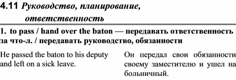 1. to pass / hand over the baton — передавать ответственность за что-л. / передавать руководство, обязанности