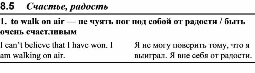 1. to walk on air — не чуять ног под собой от радости / быть очень счастливым