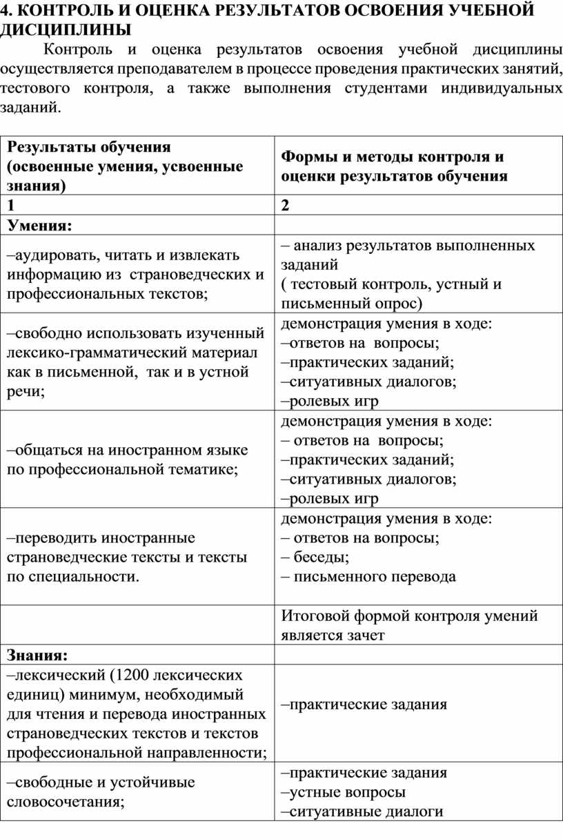 4. КОНТРОЛЬ И ОЦЕНКА РЕЗУЛЬТАТОВ ОСВОЕНИЯ УЧЕБНОЙ ДИСЦИПЛИНЫ