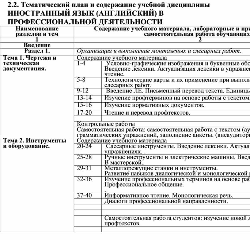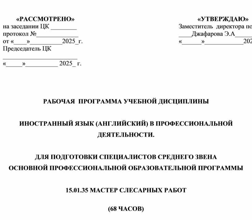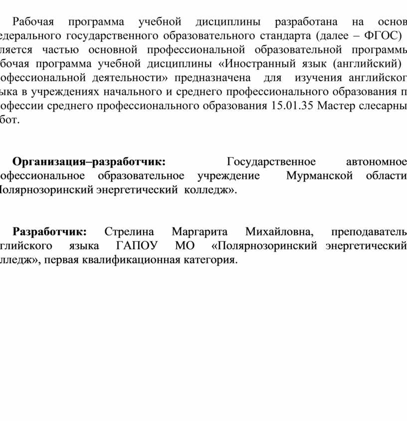 Рабочая программа учебной дисциплины разработана на основе Федерального государственного образовательного стандарта (далее – ФГОС) и является частью основной профессиональной образовательной программы. Рабочая программа учебной дисциплины «Иностранный язык (английский) в профессиональной деятельности» предназначена для изучения английского языка в учреждениях начального и среднего профессионального образования по профессии среднего профессионального образования 15.01.35 Мастер слесарных работ.
