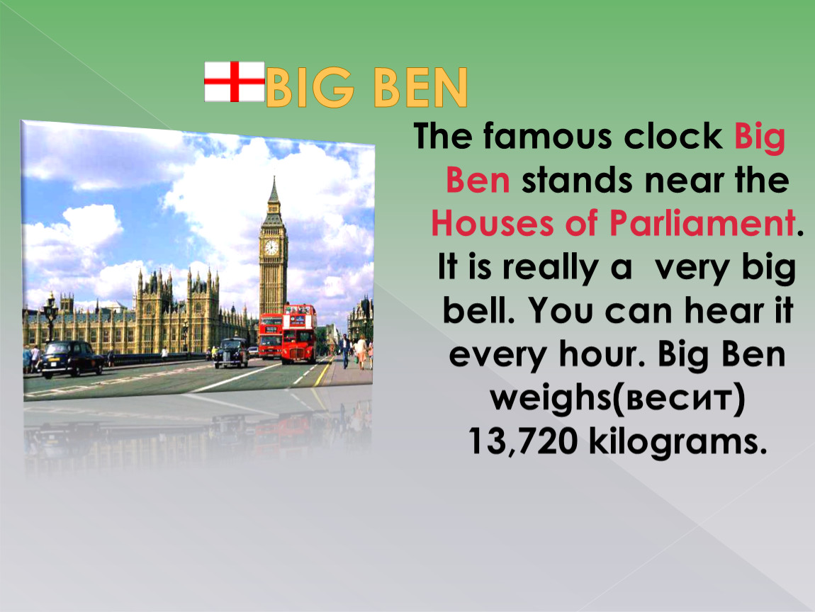 The famous clock Big Ben stands near the Houses of Parliament. It is really a very big bell. You can hear it every hour. Big Ben weighs(весит) 13,720 kilograms.