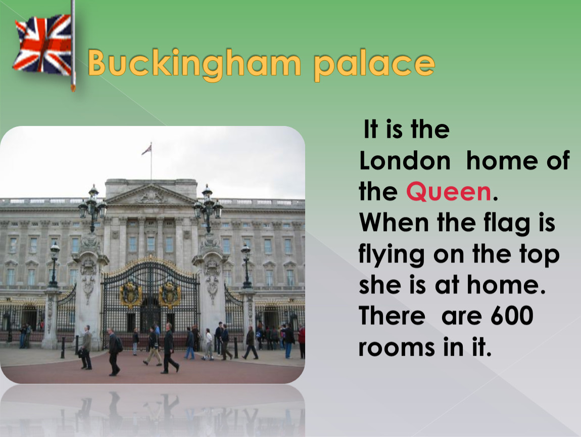 It is the London home of the Queen. When the flag is flying on the top she is at home. There are 600 rooms in it.