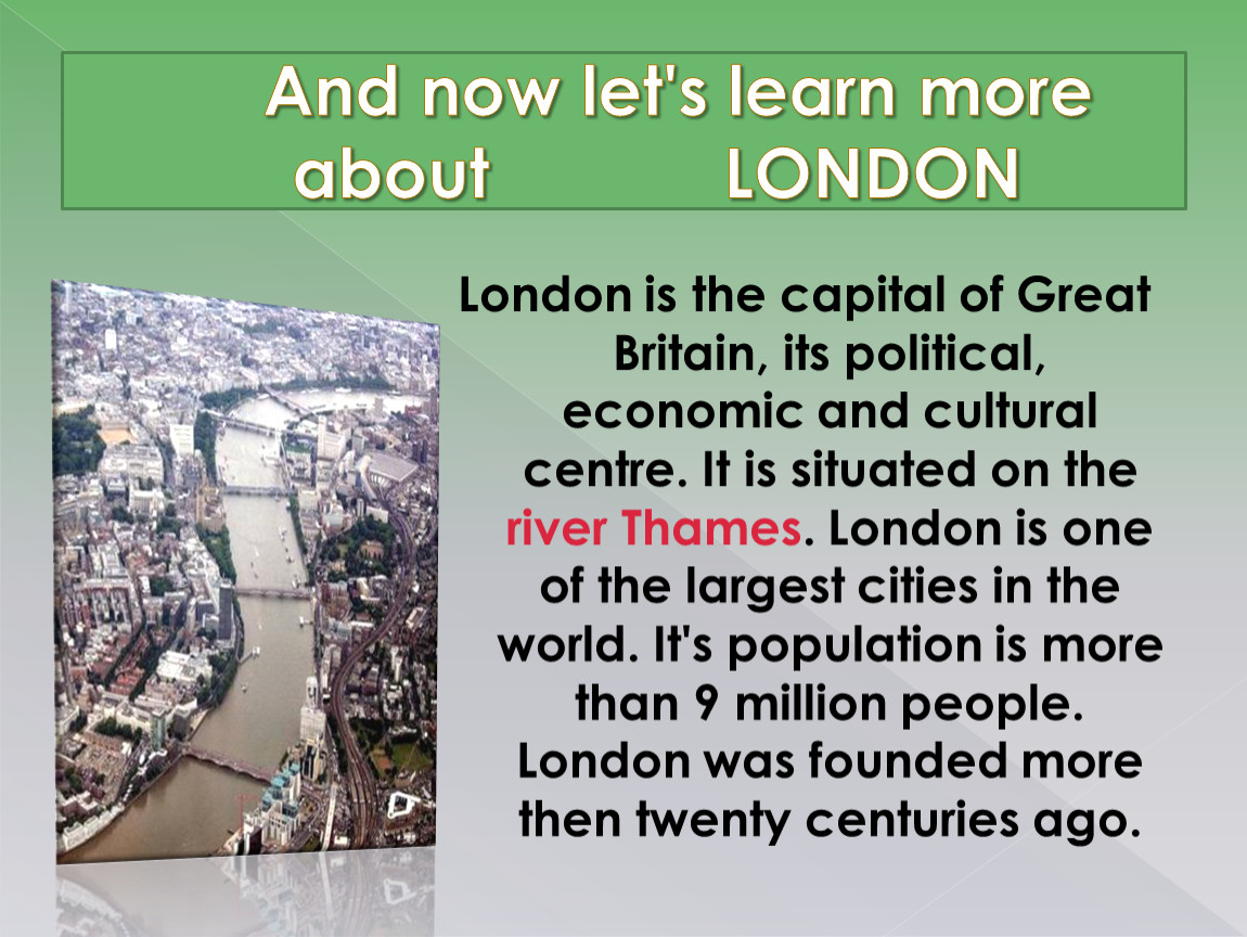 London is the capital of Great Britain, its political, economic and cultural centre. It is situated on the river Thames. London is one of the largest cities in the world. It's population is more than 9 million people. London was founded more then twenty centuries ago.