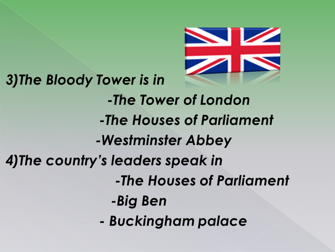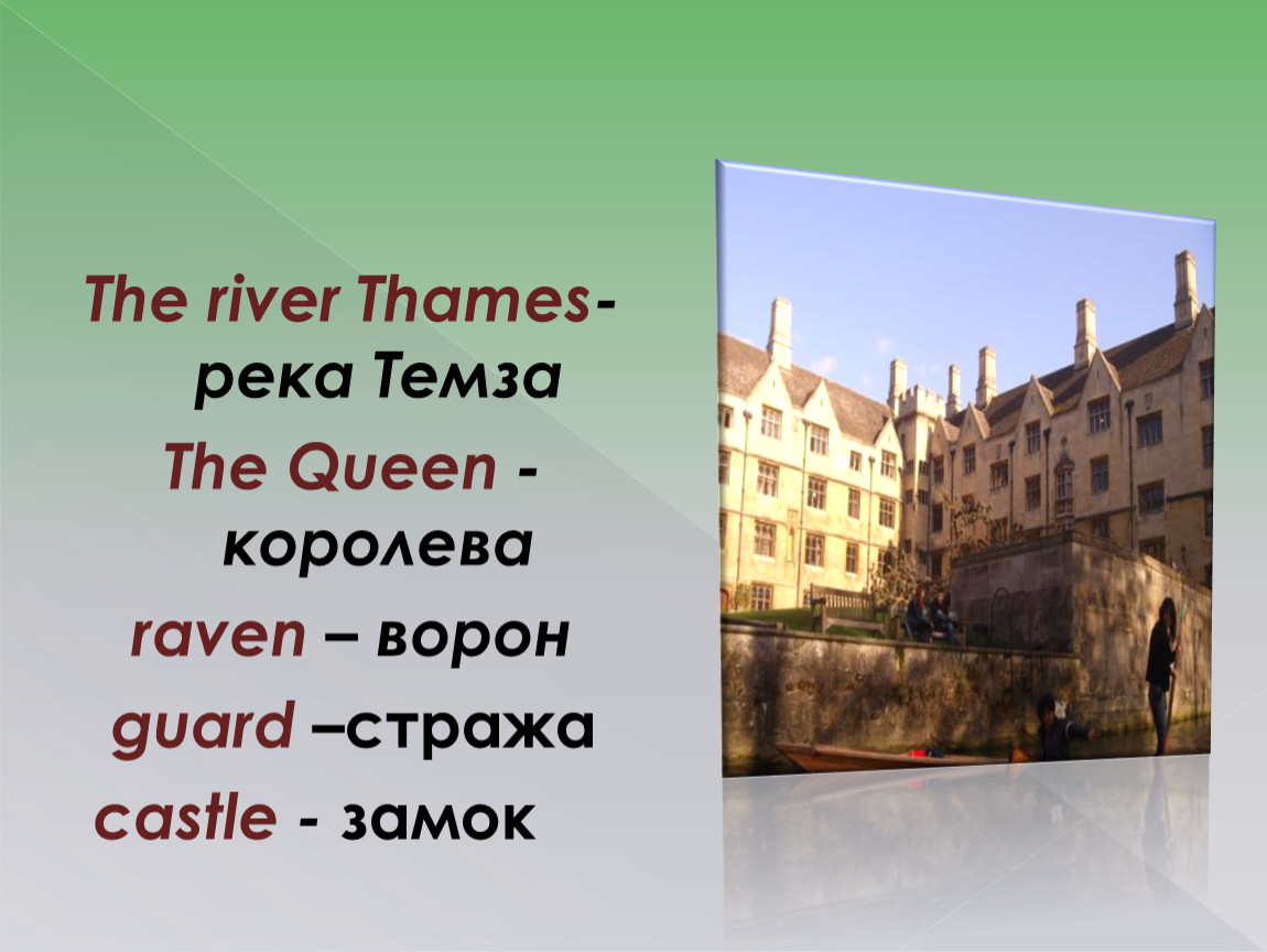 You can see the Tower of London from the river Thames. It is a very big castle(замок). It is a very old place in London. The tall building is the White Tower. The Bloody Tower is near the river. The Tower is a museum now.
