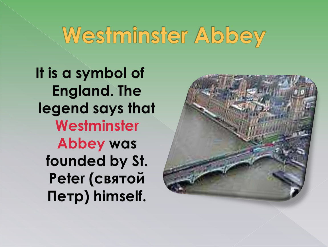It is a symbol of England. The legend says that Westminster Abbey was founded by St. Peter (святой Петр) himself.