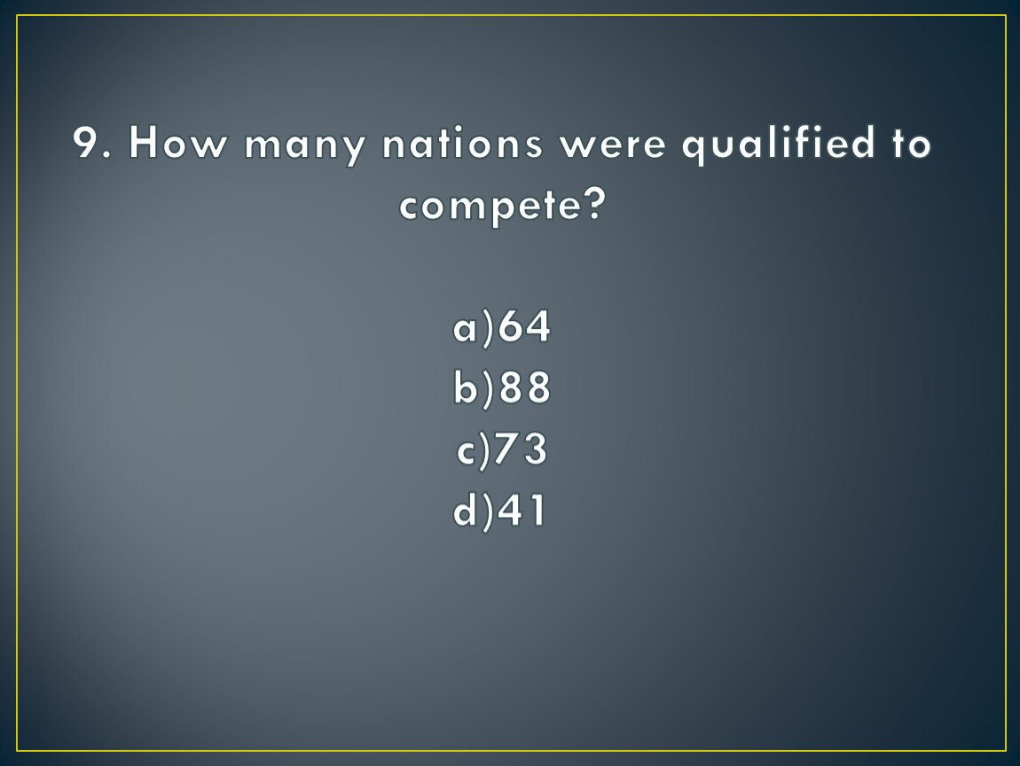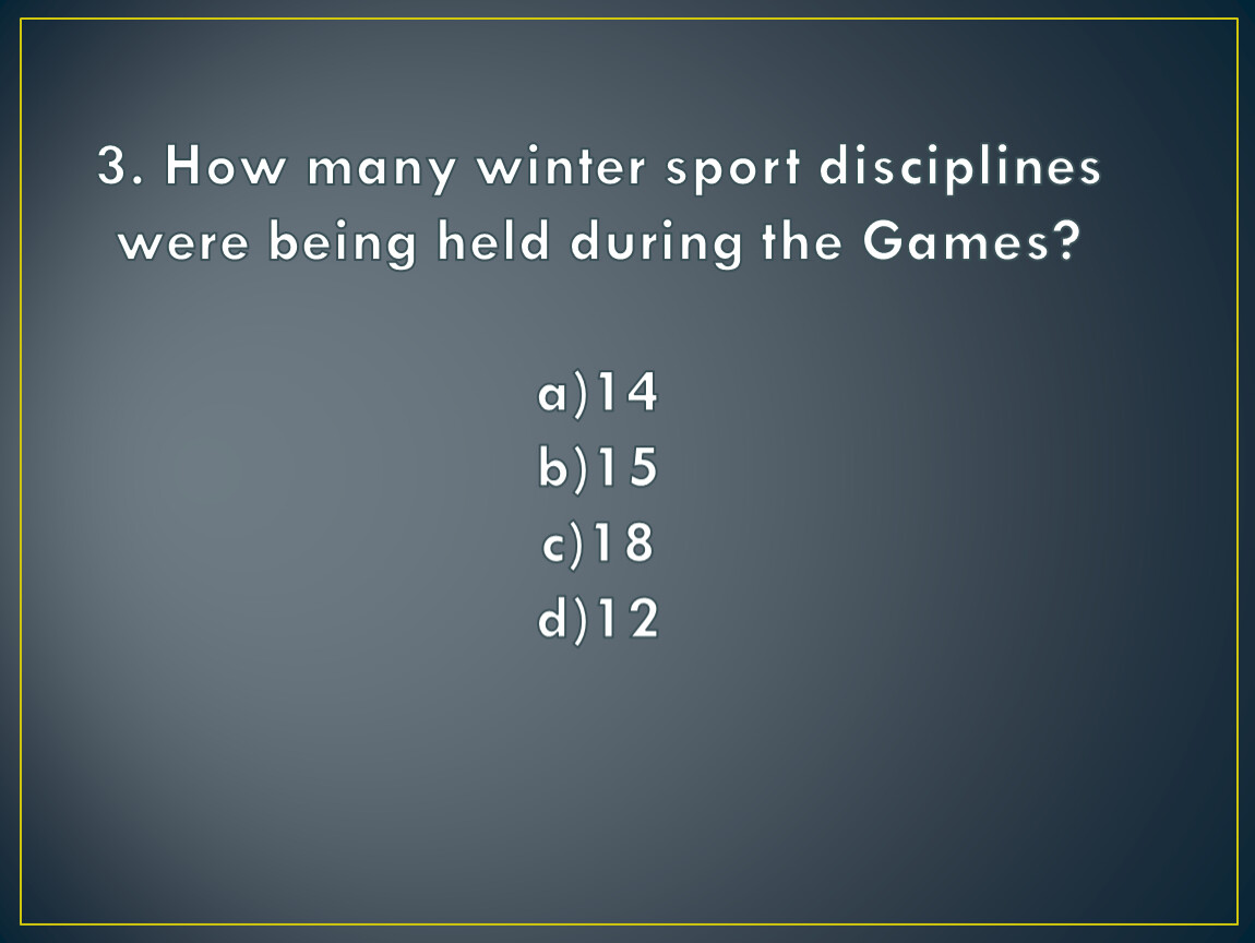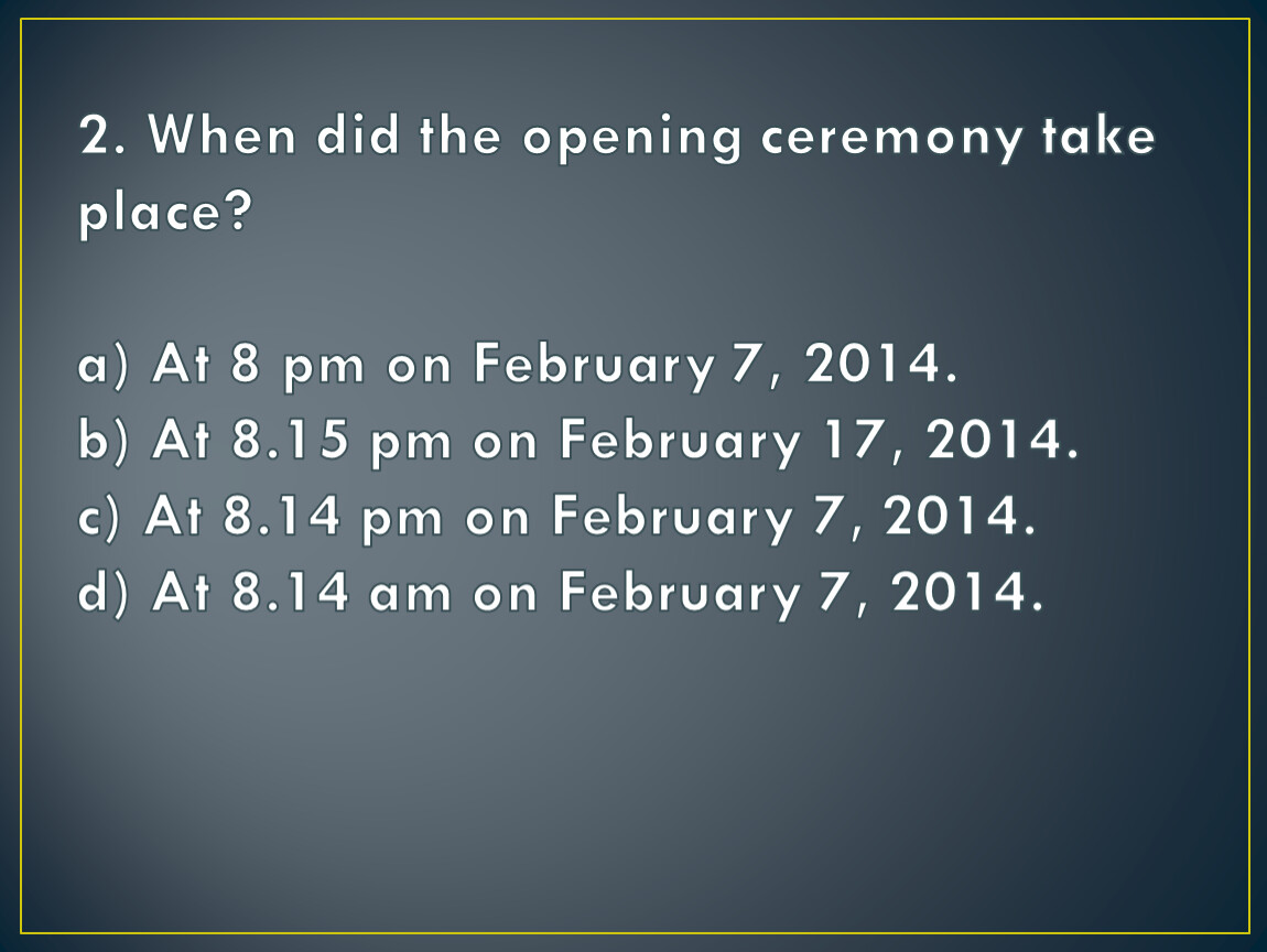 2. When did the opening ceremony take place?a) At 8 pm on February 7, 2014.b) At 8.15 pm on February 17, 2014.c) At 8.14 pm on February 7, 2014.d) At 8.14 am on February 7, 2014.