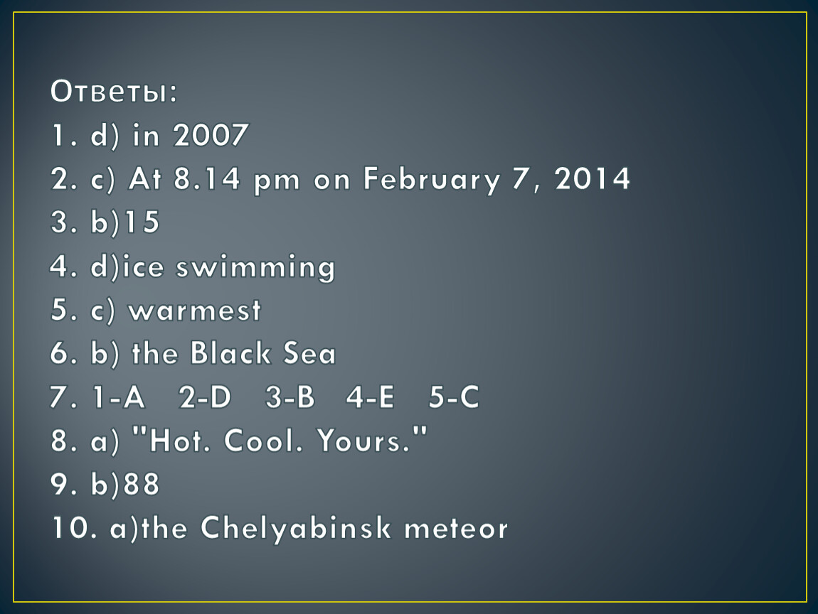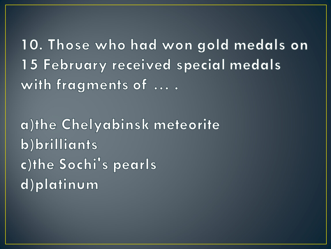 10. Those who had won gold medals on 15 February received special medals with fragments of … .a)the Chelyabinsk meteoriteb)brilliantsc)the Sochi's pearlsd)platinum