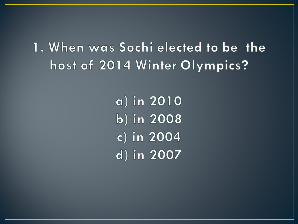 1. When was Sochi elected to be the host of 2014 Winter Olympics?a) in 2010b) in 2008c) in 2004d) in 2007