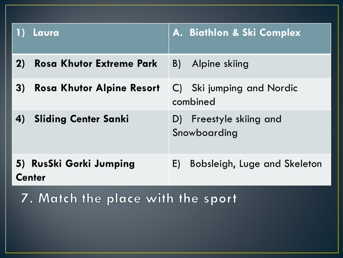 2) Rosa Khutor Extreme Park | B) Alpine skiing |