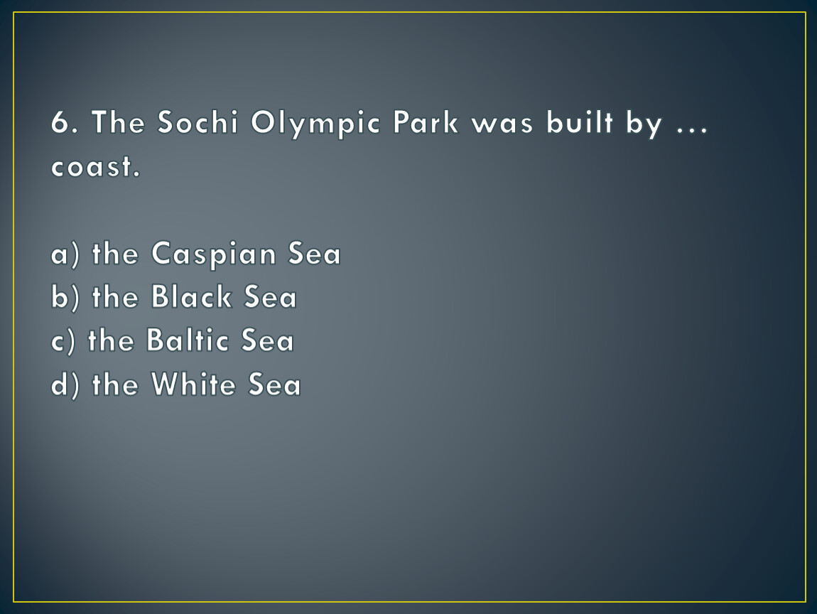 6. The Sochi Olympic Park was built by … coast.a) the Caspian Seab) the Black Sea c) the Baltic Sead) the White Sea