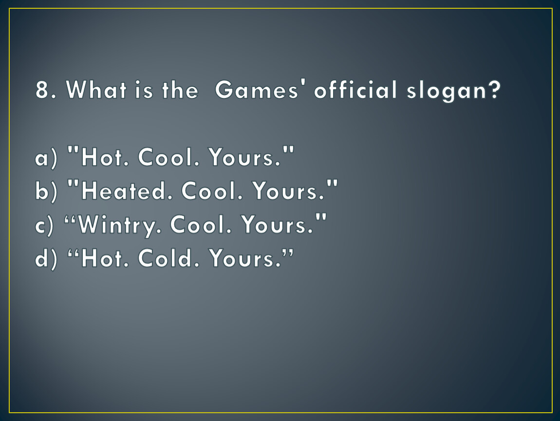 8. What is the Games' official slogan?a) "Hot. Cool. Yours." b) "Heated. Cool. Yours."c) “Wintry. Cool. Yours."d) “Hot. Cold. Yours.”