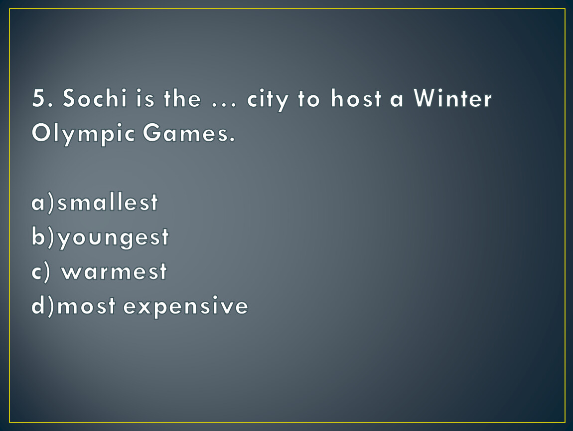 5. Sochi is the … city to host a Winter Olympic Games.a)smallestb)youngestc) warmestd)most expensive