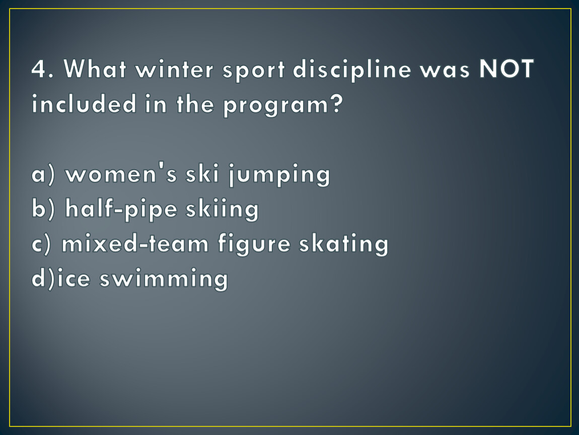 4. What winter sport discipline was NOT included in the program?a) women's ski jumpingb) half-pipe skiingc) mixed-team figure skatingd)ice swimming