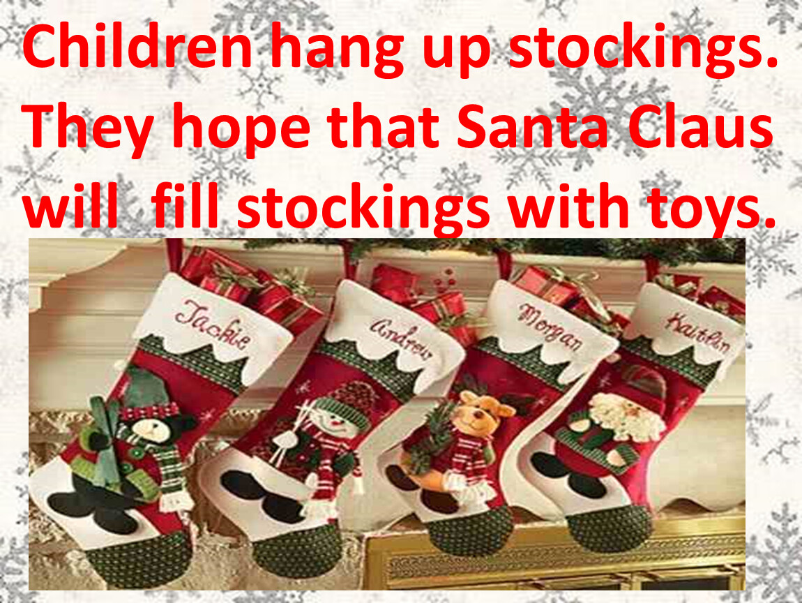 Children hang up stockings. They hope that Santa Claus will fill stockings with toys.