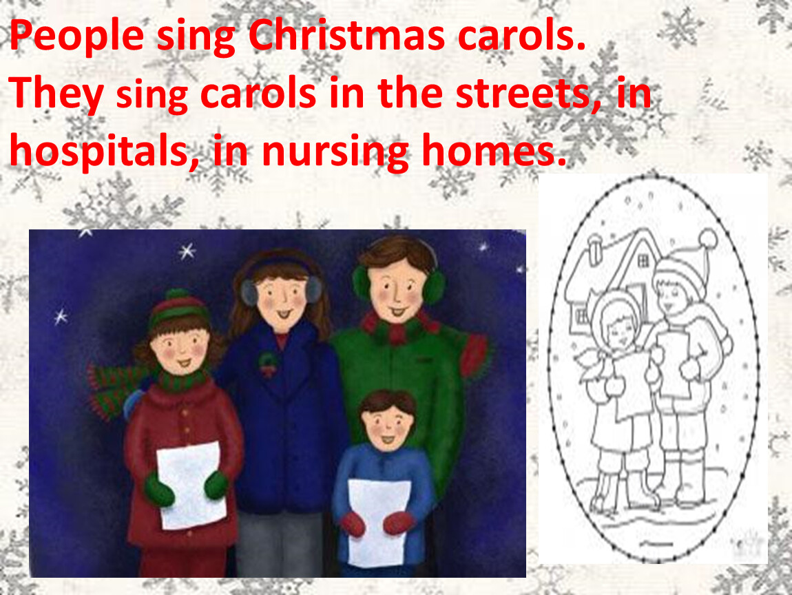 People sing Christmas carols. They sing carols in the streets, in hospitals, in nursing homes.