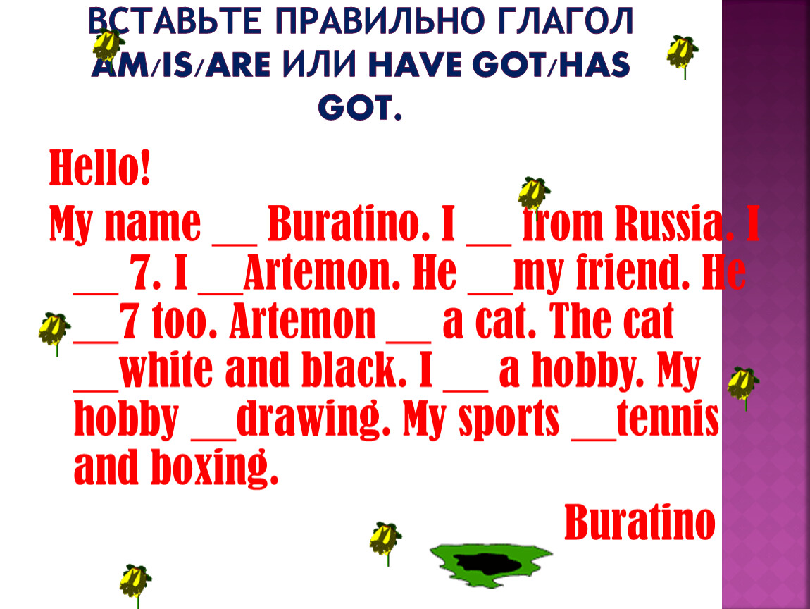 My name __ Buratino. I __ from Russia. I __ 7. I __Artemon. He __my friend. He __7 too. Artemon __ a cat. The cat __white and black. I __ a hobby. My hobby __drawing. My sports __tennis and boxing.
