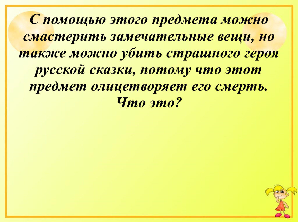 С помощью этого предмета можно смастерить замечательные вещи, но также можно убить страшного героя русской сказки, потому что этот предмет олицетворяет его смерть.