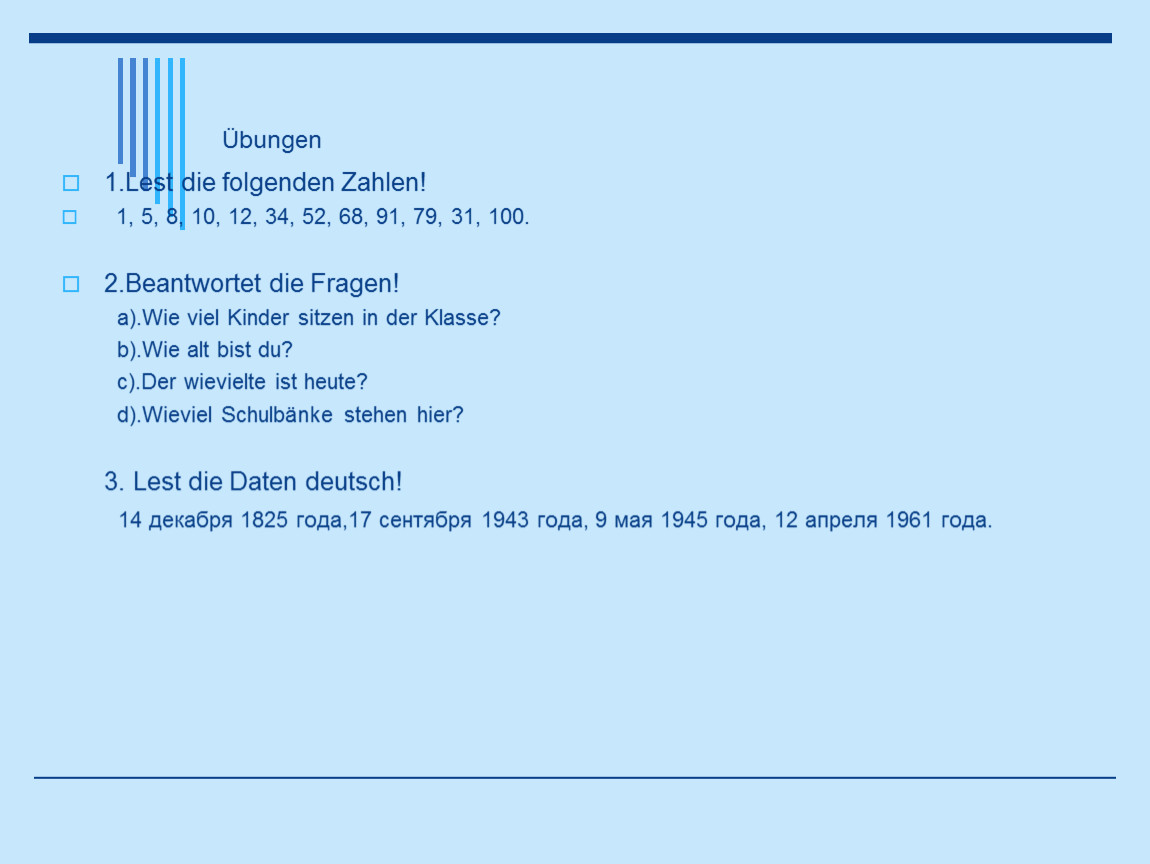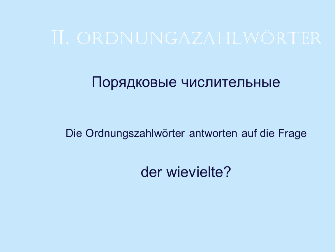 II. ORDNUNGAZAHLWÖRTER Порядковые числительныеDie Ordnungszahlwörter antworten auf die Frage der wievielte?