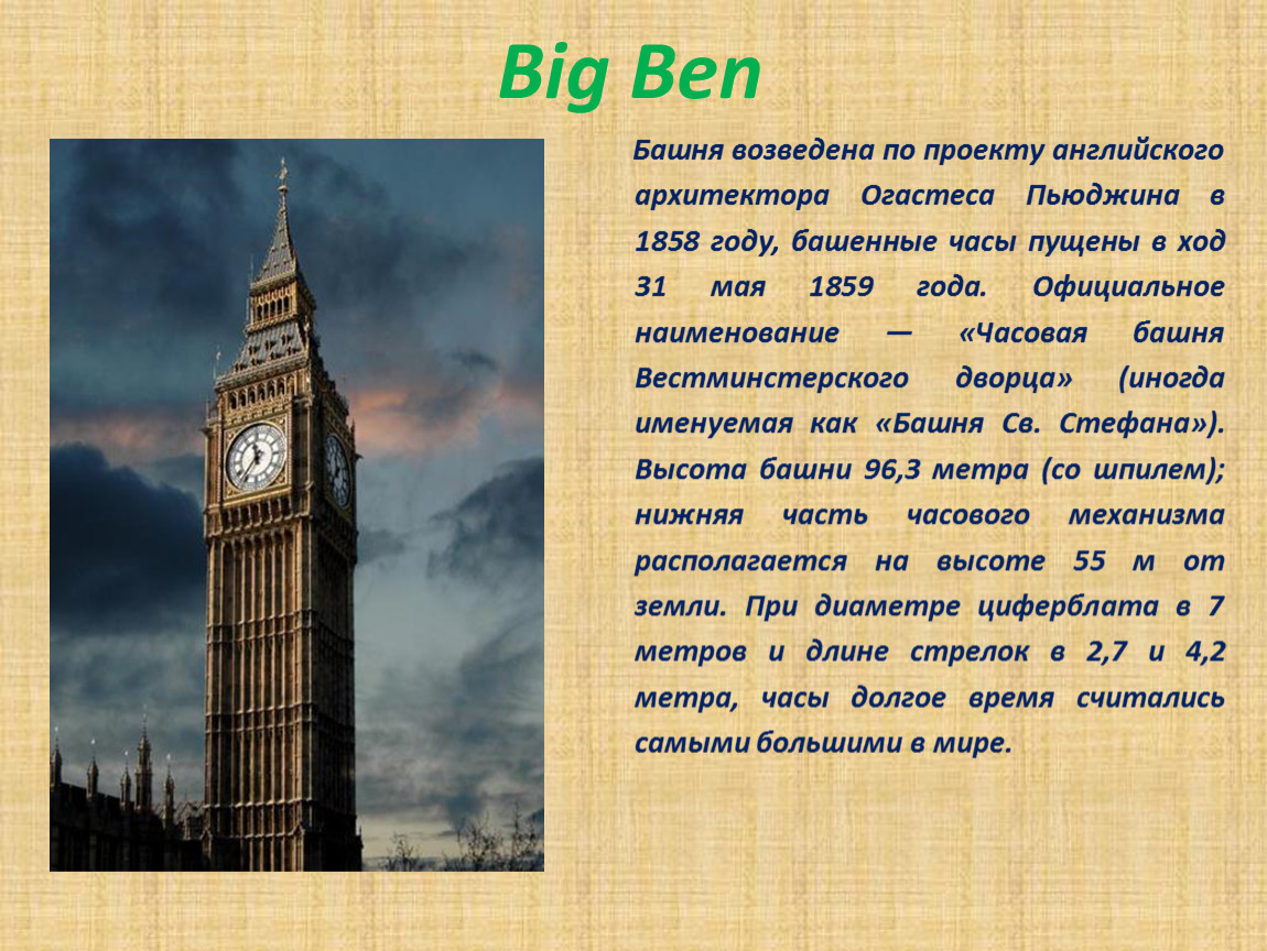 Башня возведена по проекту английского архитектора Огастеса Пьюджина в 1858 году, башенные часы пущены в ход 31 мая 1859 года. Официальное наименование — «Часовая башня Вестминстерского дворца» (иногда именуемая как «Башня Св. Стефана»). Высота башни 96,3 метра (со шпилем); нижняя часть часового механизма располагается на высоте 55 м от земли. При диаметре циферблата в 7 метров и длине стрелок в 2,7 и 4,2 метра, часы долгое время считались самыми большими в мире.