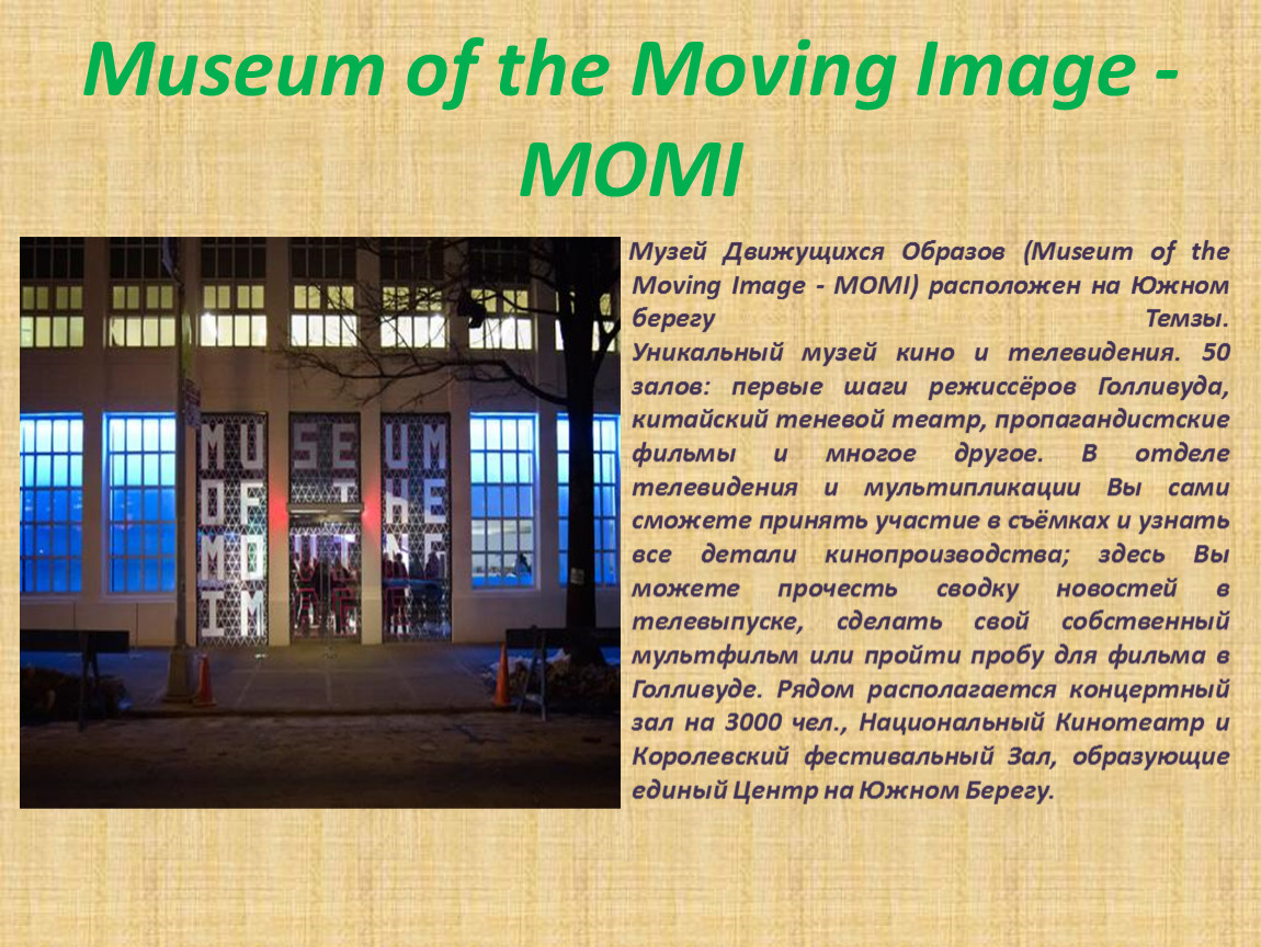 Музей Движущихся Образов (Museum of the Moving Image - MOMI) расположен на Южном берегу Темзы.Уникальный музей кино и телевидения. 50 залов: первые шаги режиссёров Голливуда, китайский теневой театр, пропагандистские фильмы и многое другое. В отделе телевидения и мультипликации Вы сами сможете принять участие в съёмках и узнать все детали кинопроизводства; здесь Вы можете прочесть сводку новостей в телевыпуске, сделать свой собственный мультфильм или пройти пробу для фильма в Голливуде. Рядом располагается концертный зал на 3000 чел., Национальный Кинотеатр и Королевский фестивальный Зал, образующие единый Центр на Южном Берегу.