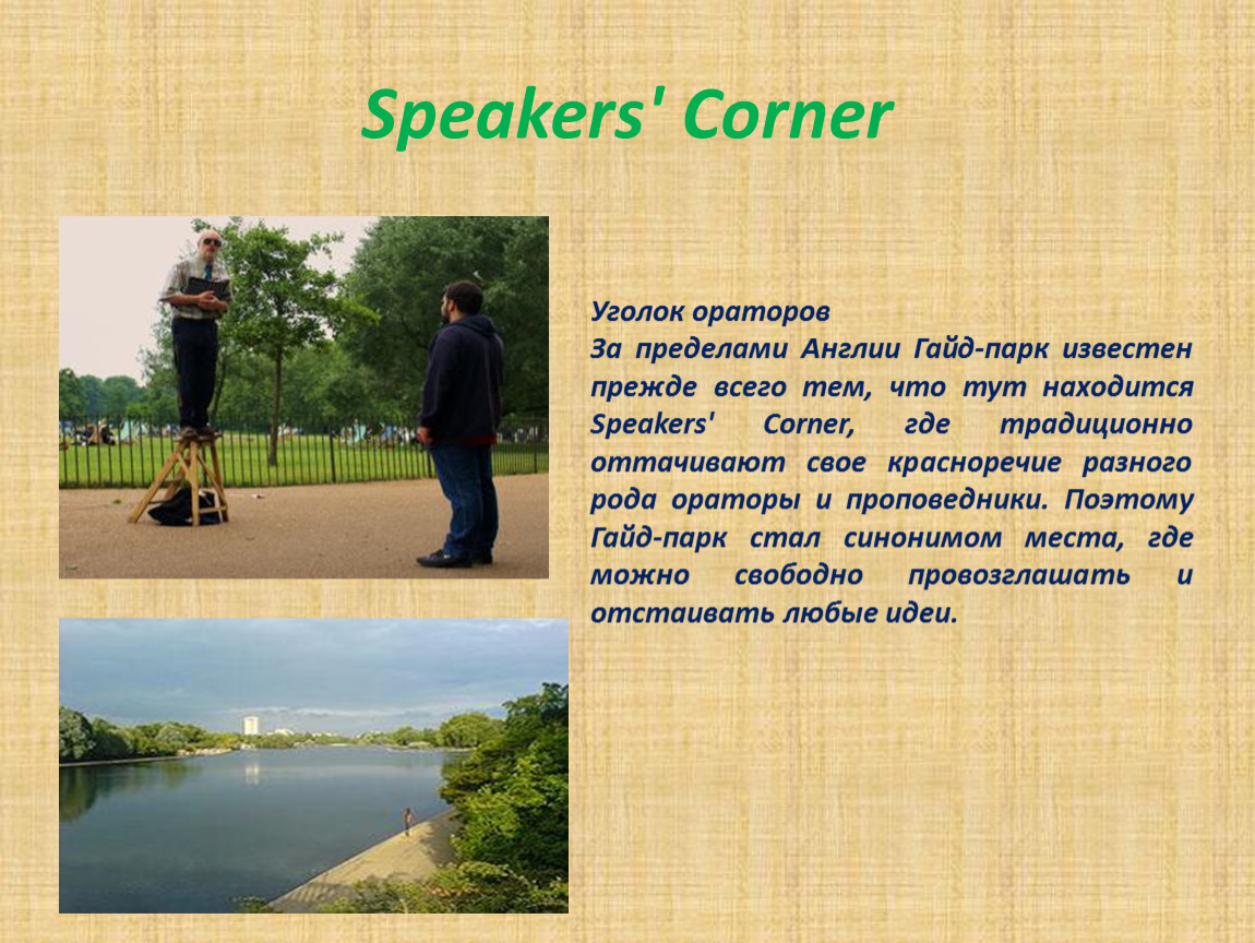 За пределами Англии Гайд-парк известен прежде всего тем, что тут находится Speakers' Corner, где традиционно оттачивают свое красноречие разного рода ораторы и проповедники. Поэтому Гайд-парк стал синонимом места, где можно свободно провозглашать и отстаивать любые идеи.