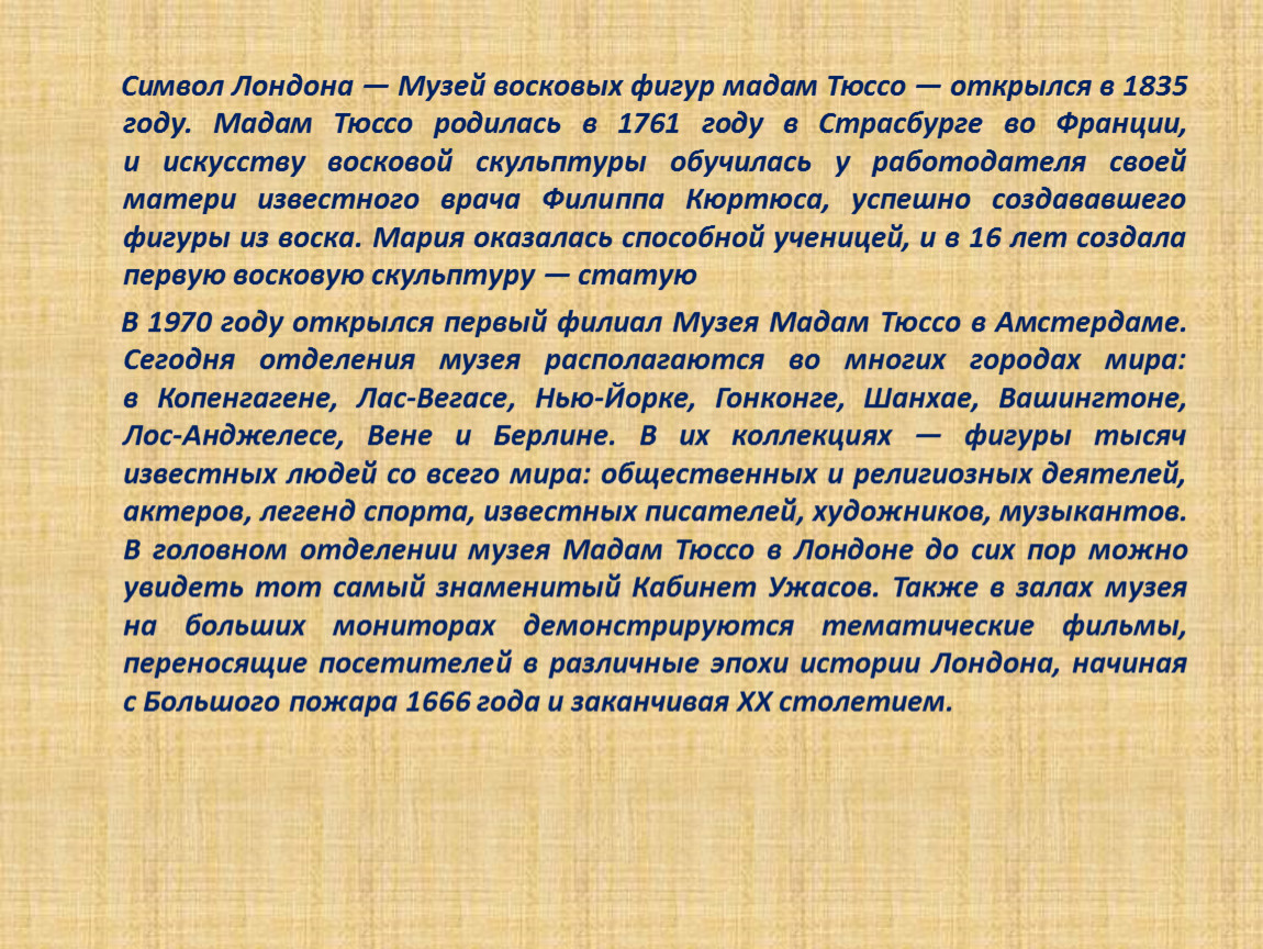 Символ Лондона — Музей восковых фигур мадам Тюссо — открылся в 1835 году. Мадам Тюссо родилась в 1761 году в Страсбурге во Франции, и искусству восковой скульптуры обучилась у работодателя своей матери известного врача Филиппа Кюртюса, успешно создававшего фигуры из воска. Мария оказалась способной ученицей, и в 16 лет создала первую восковую скульптуру — статую