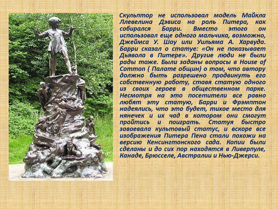 Скульптор не использовал модель Майкла Ллевелина Дэвиса на роль Питера, как собирался Барри. Вместо этого он использовал еще одного мальчика, возможно, Джеймса У. Шоу или Уильяма А. Харвуда. Барри сказал о статуе: «Он не показывает Дьявола в Питере». Другие люди не были рады тоже. Были заданы вопросы в House of Common ( Палате общин) о том, что автору должно быть разрешено продвинуть его собственную работу, ставя статую одного из своих героев в общественном парке. Несмотря на это посетители все равно любят эту статую, Барри и Фрэмптон надеялись, что это будет, тихое место для нянечек и их чад в котором они смогут пройтись и поиграть. Статуя быстро завоевала культовый статус, и вскоре все изображения Питера Пена стали похожи на версию Кенсингтонского сада. Копии были сделаны и до сих пор находятся в Ливерпуле, Канаде, Брюсселе, Австралии и Нью-Джерси.