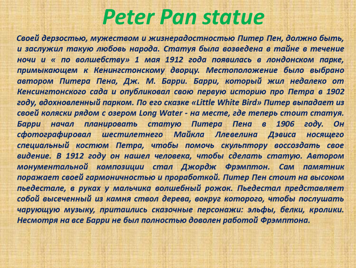 Своей дерзостью, мужеством и жизнерадостностью Питер Пен, должно быть, и заслужил такую любовь народа. Статуя была возведена в тайне в течение ночи и « по волшебству» 1 мая 1912 года появилась в лондонском парке, примыкающем к Кенингстонскому дворцу. Местоположение было выбрано автором Питера Пена, Дж. М. Барри. Барри, который жил недалеко от Кенсингтонского сада и опубликовал свою первую историю про Петра в 1902 году, вдохновленный парком. По его сказке «Little White Bird» Питер выпадает из своей коляски рядом с озером Long Water - на месте, где теперь стоит статуя. Барри начал планировать статую Питера Пена в 1906 году. Он сфотографировал шестилетнего Майкла Ллевелина Дэвиса носящего специальный костюм Петра, чтобы помочь скульптору воссоздать свое видение. В 1912 году он нашел человека, чтобы сделать статую. Автором монументальной композиции стал Джордж Фрэмптон. Сам памятник поражает своей гармоничностью и проработкой. Питер Пен стоит на высоком пьедестале, в руках у мальчика волшебный рожок. Пьедестал представляет собой высеченный из камня ствол дерева, вокруг которого, чтобы послушать чарующую музыку, притаились сказочные персонажи: эльфы, белки, кролики. Несмотря на все Барри не был полностью доволен работой Фрэмптона.