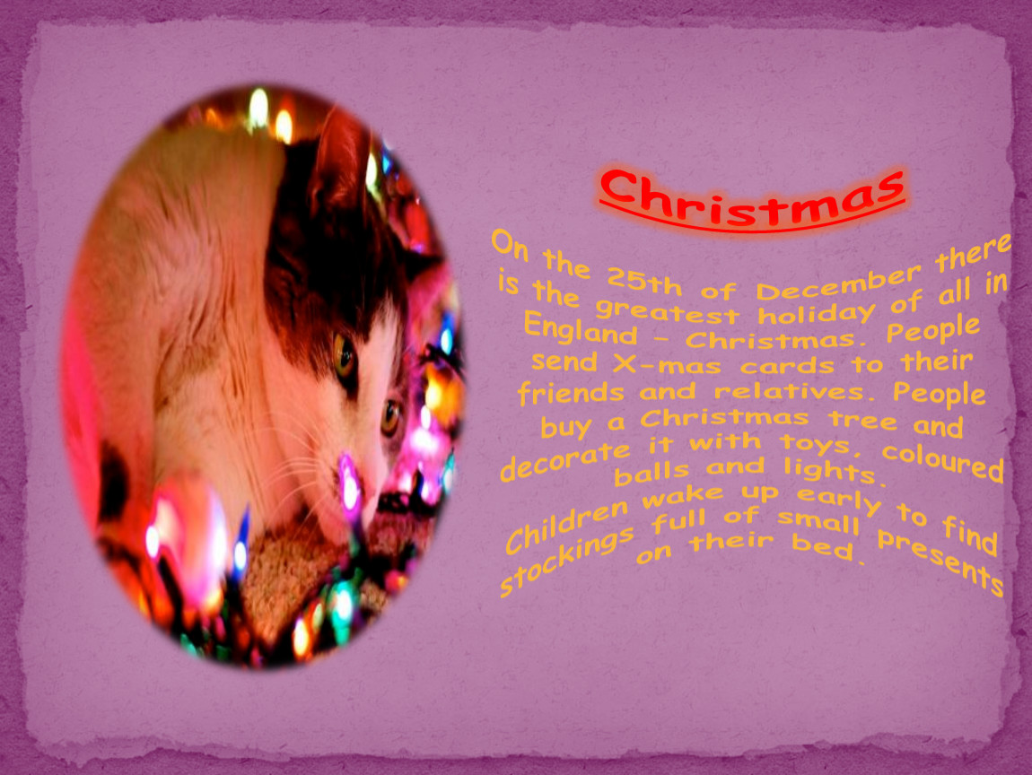 On the 25th of December there is the greatest holiday of all in England – Christmas. People send X-mas cards to their friends and relatives. People buy a Christmas tree and decorate it with toys, coloured balls and lights.