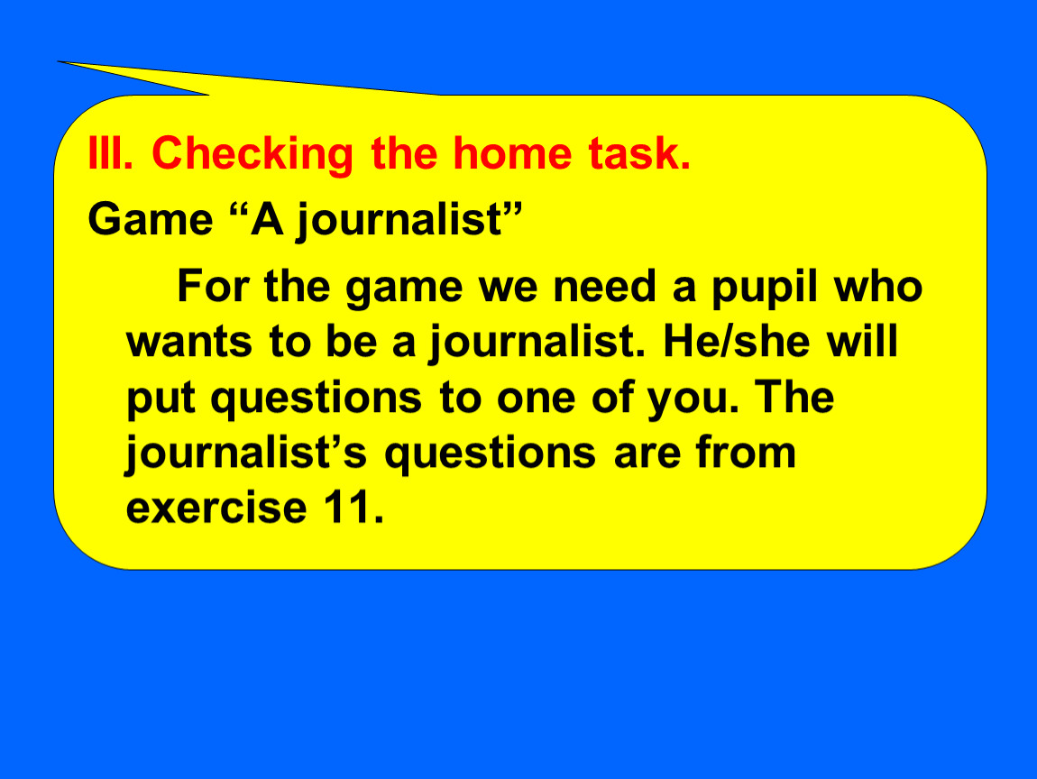 For the game we need a pupil who wants to be a journalist. He/she will put questions to one of you. The journalist’s questions are from exercise 11.