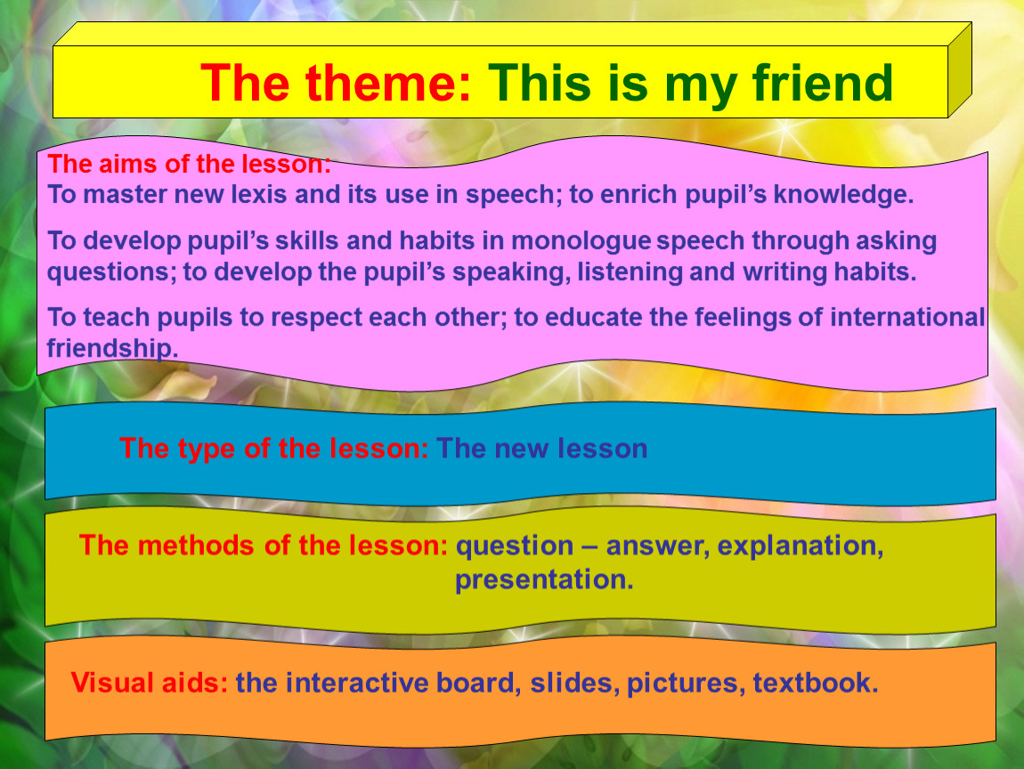 The aims of the lesson: To master new lexis and its use in speech; to enrich pupil’s knowledge.