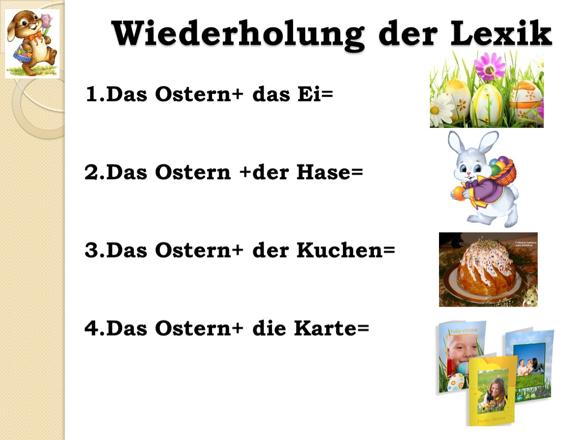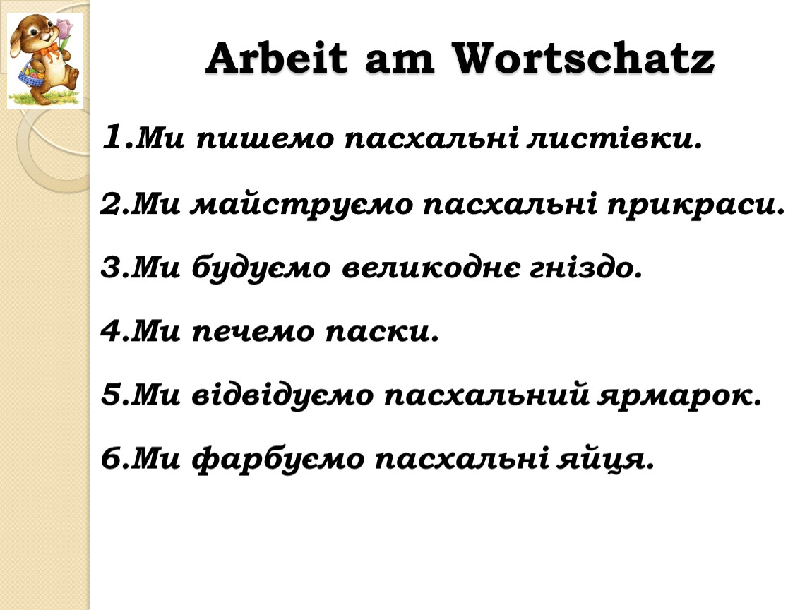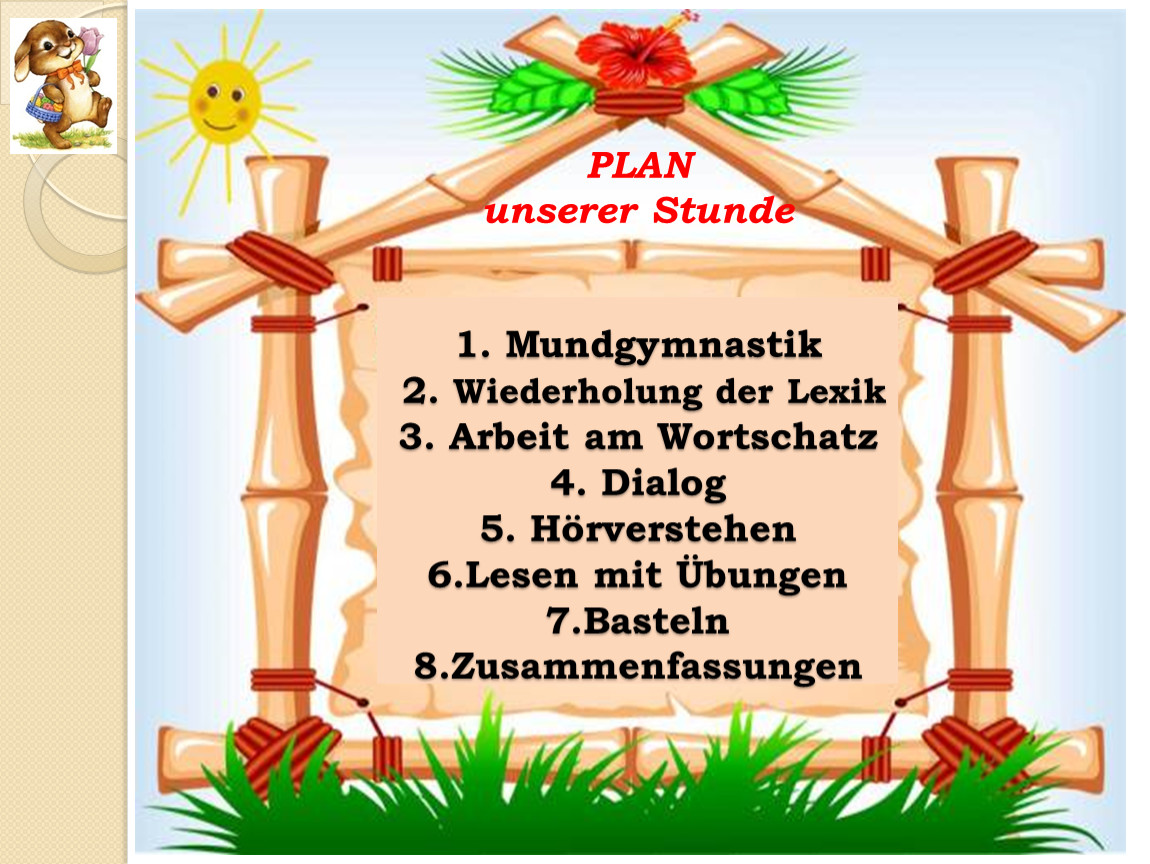 1. Mundgymnastik 2. Wiederholung der Lexik3. Arbeit am Wortschatz 4. Dialog5. Hörverstehen 6.Lesen mit Übungen7.Basteln8.Zusammenfassungen
