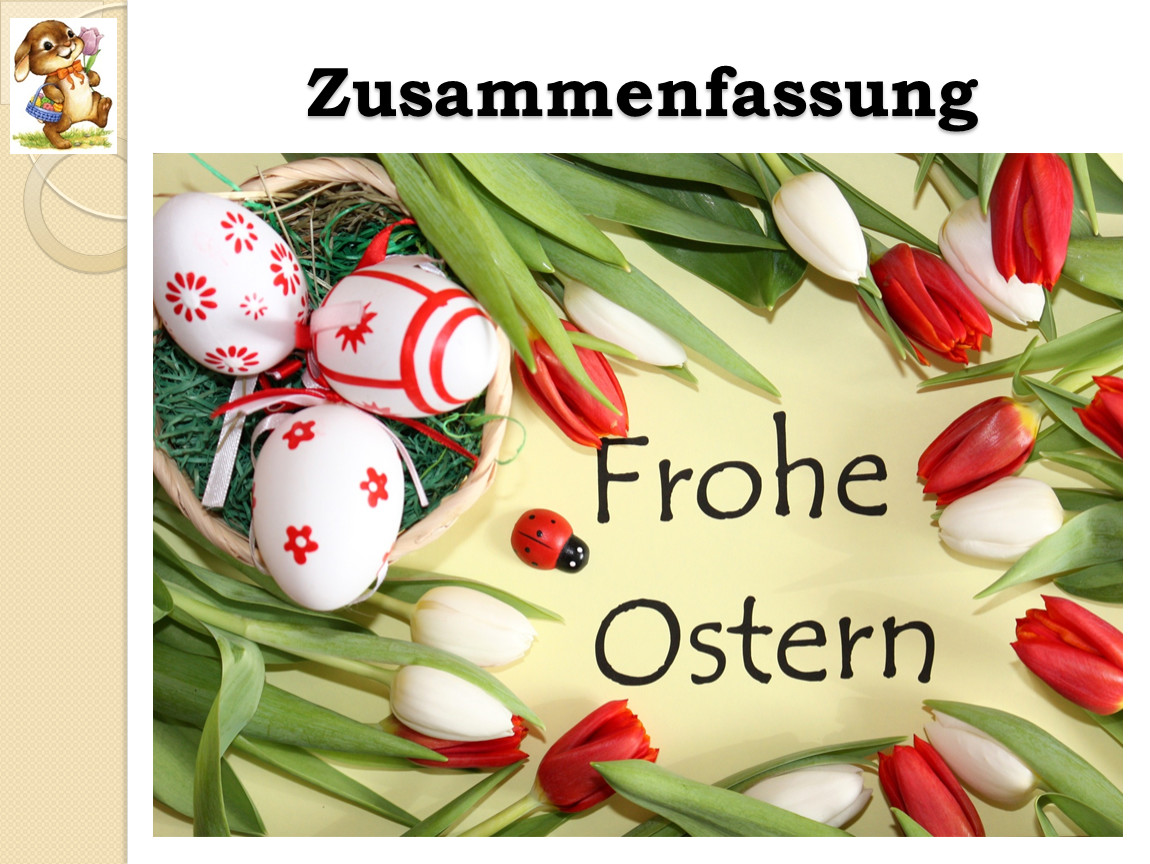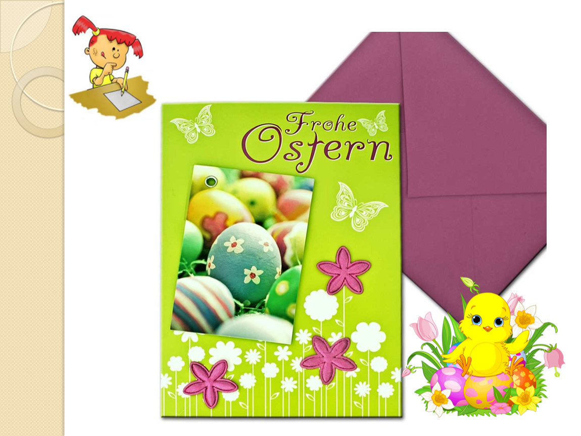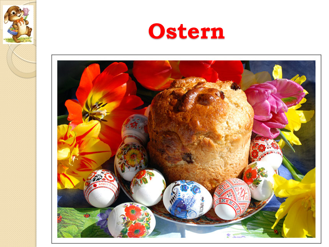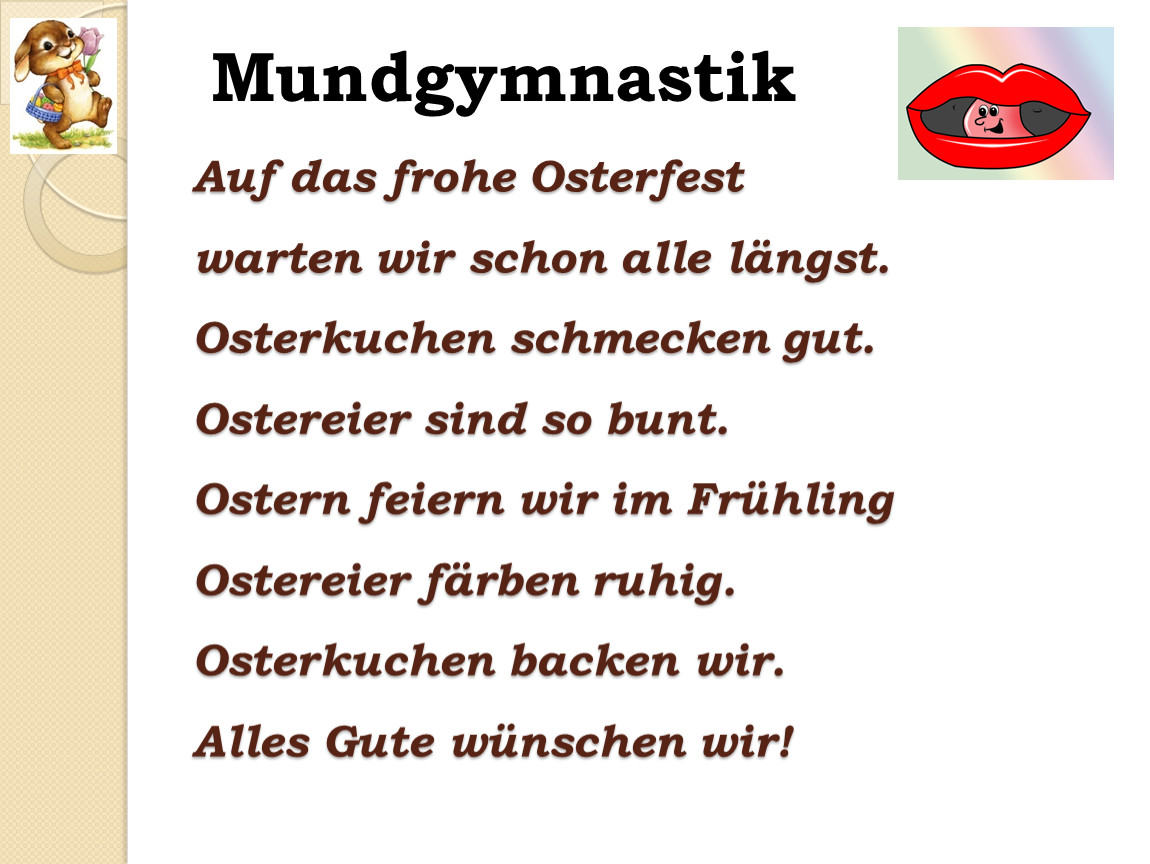 Auf das frohe Osterfestwarten wir schon alle längst.Osterkuchen schmecken gut.Ostereier sind so bunt.Ostern feiern wir im FrühlingOstereier färben ruhig.Osterkuchen backen wir.Alles Gute wünschen wir!