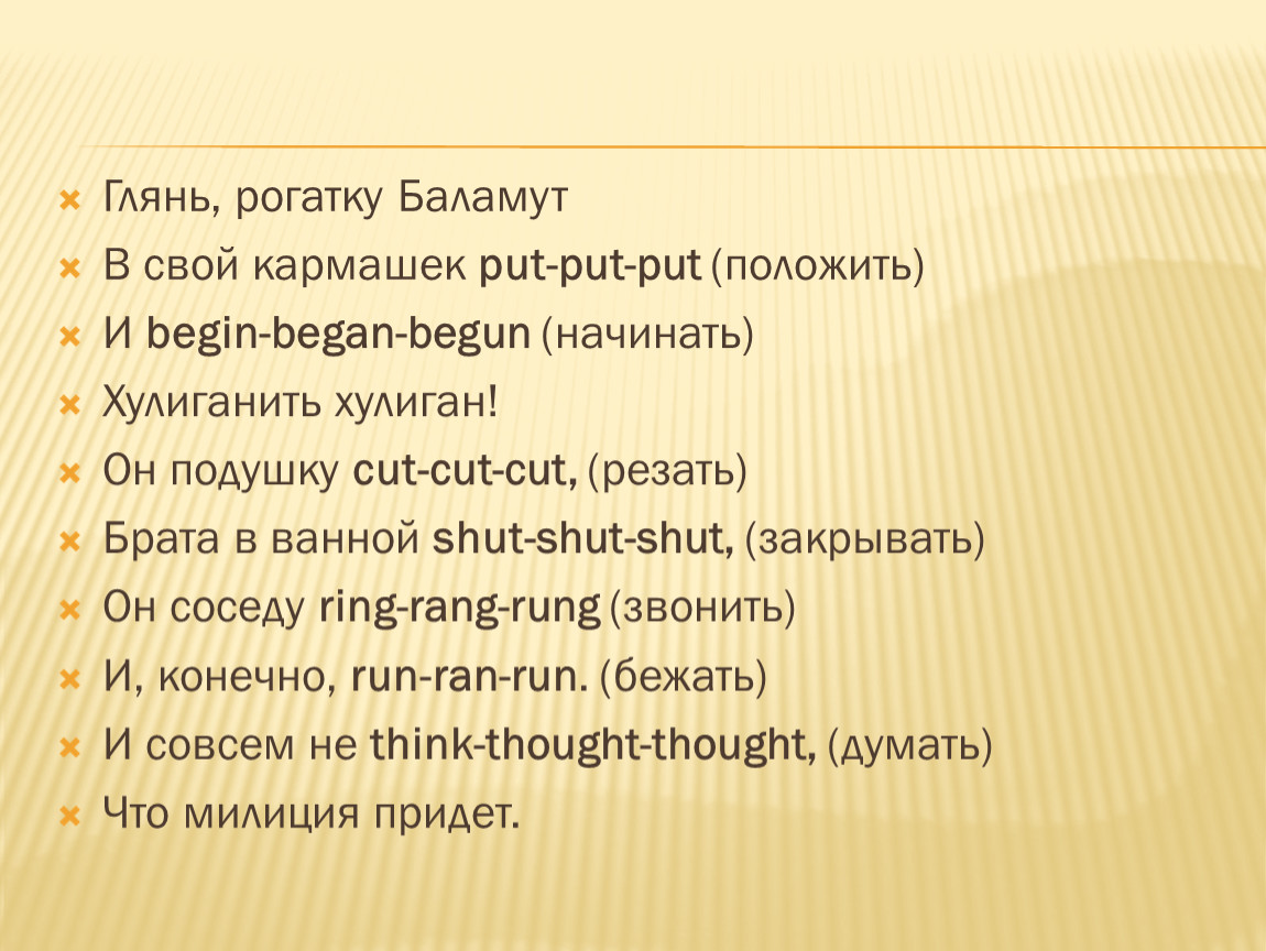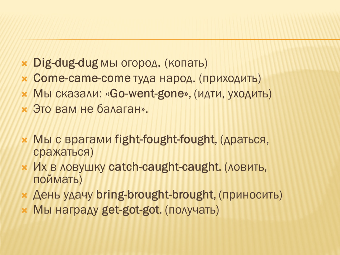 Мы сказали: «Go-went-gone», (идти, уходить)