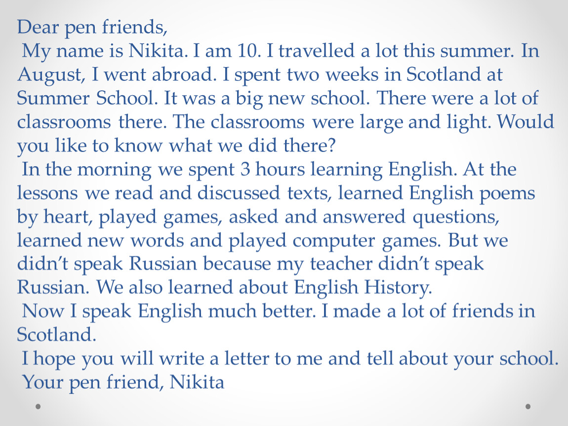 Dear pen friends, My name is Nikita. I am 10. I travelled a lot this summer. In August, I went abroad. I spent two weeks in Scotland at Summer School. It was a big new school. There were a lot of classrooms there. The classrooms were large and light. Would you like to know what we did there? In the morning we spent 3 hours learning English. At the lessons we read and discussed texts, learned English poems by heart, played games, asked and answered questions, learned new words and played computer games. But we didn’t speak Russian because my teacher didn’t speak Russian. We also learned about English History. Now I speak English much better. I made a lot of friends in Scotland. I hope you will write a letter to me and tell about your school. Your pen friend, Nikita