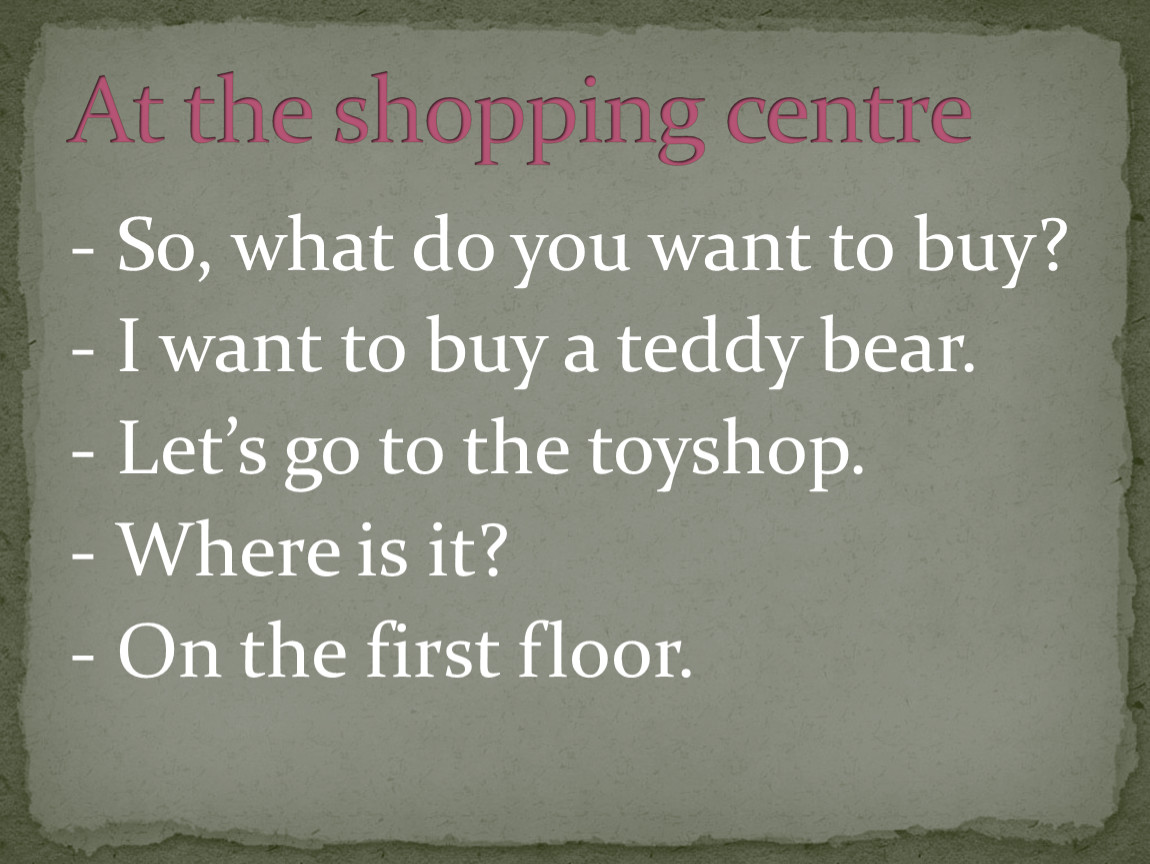 - So, what do you want to buy? - I want to buy a teddy bear. - Let’s go to the toyshop. - Where is it? - On the first floor.