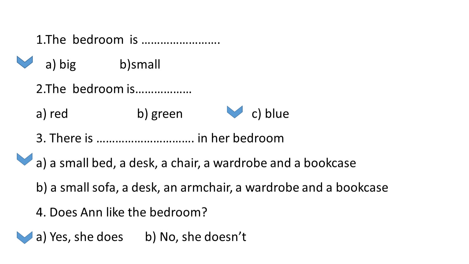 b) a small sofa, a desk, an armchair, a wardrobe and a bookcase