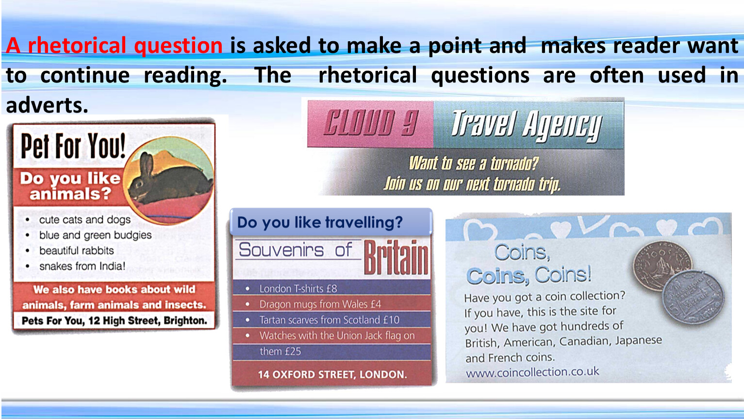 A rhetorical question is asked to make a point and makes reader want to continue reading. The rhetorical questions are often used in adverts.