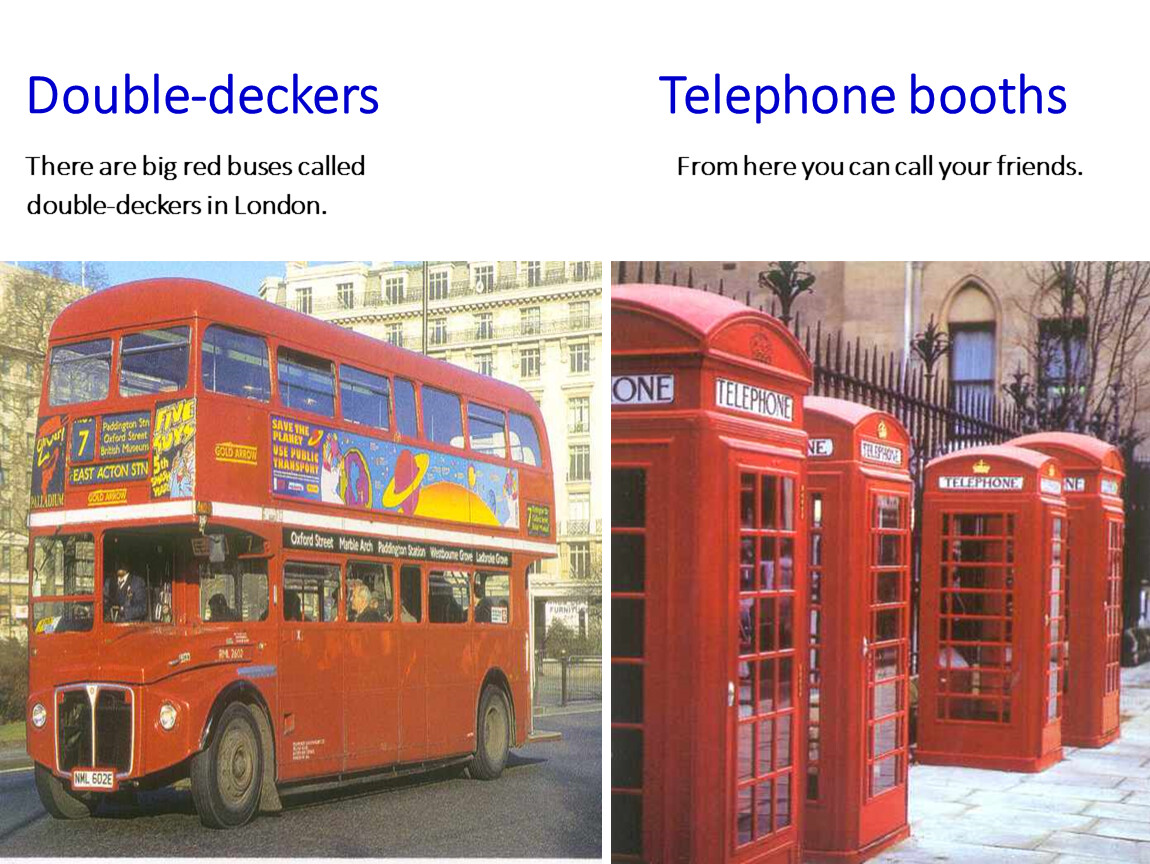 Double-deckers Telephone booths There are big red buses called From here you can call your friends. double-deckers in London.